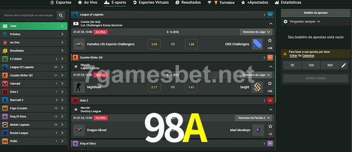 O 98A oferece uma grande seleção de opções de apostas em e-sports com probabilidades competitivas